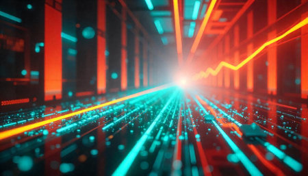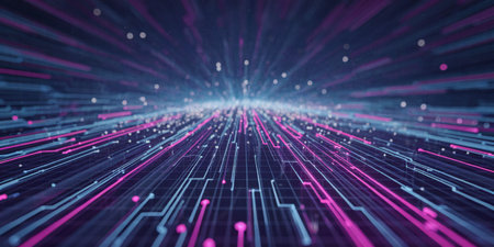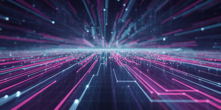 Vibrant digital landscape with pink and blue light streaks representing data movement.