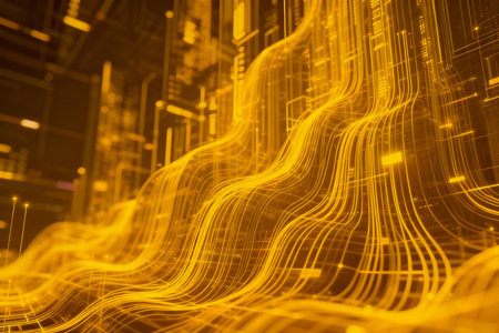 An abstract visualization depicts flowing lines of digital data in various colors. The composition includes a blurred background featuring graphs and data displays. The scene is illuminated with a futuristic glow, suggesting a technological or scientific context. Suitable for illustrating concepts related to data, networks, and technology.