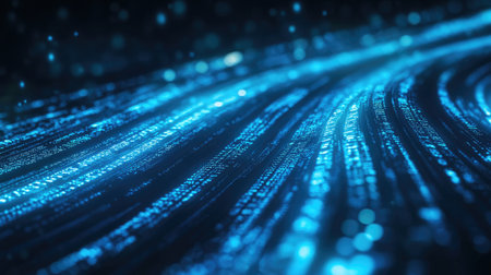 This mesmerizing image features flowing blue light waves with sparkling digital particles, set against a dark background, creating a captivating futuristic atmosphere.