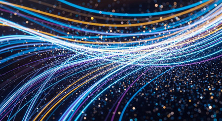 This image showcases a vibrant digital representation of data streams, rendered with dynamic glowing lines. The composition employs a dark backdrop, emphasizing the bright, colorful flow of information. It could be used in projects related to technology, communication, or futuristic concepts. The style is modern, with an emphasis on visual appeal.