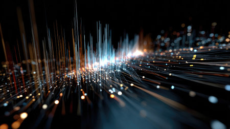 A dark background with numerous glowing lines of light particles in blue and orange hues, converging and diverging in a dynamic flow.