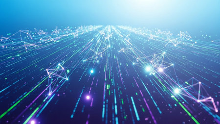 An abstract network of glowing blue and green light trails and particles creates a sense of digital movement and connection.