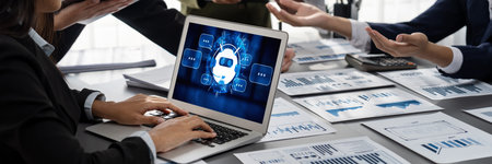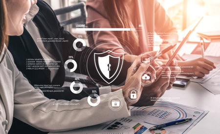 Two businesswomen working on the project to protect cyber security of international company. Padlock Hologram icons over the table with documents.
