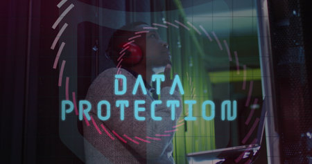 Data protection, Cyber security, information privacy. Internet and technology concept. Server room background.