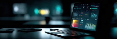 An open laptop displays a bright dashboard UI in a dimly lit workspace, surrounded by softly glowing monitors, enhancing the modern tech atmosphere.