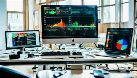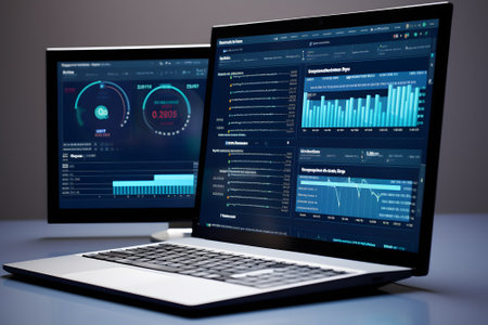 Dynamic representation of financial analytics on modern screens, highlighting various data metrics, perfect for illustrating technology and business concepts in a contemporary setting.