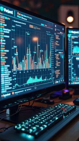 A computer screen displays a vibrant financial data chart with colorful lines and metrics. Ideal for illustrating modern business analysis and digital visualization.