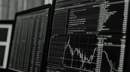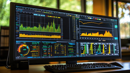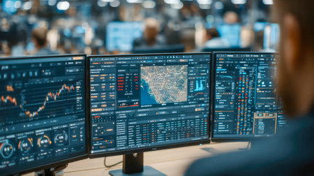 A detailed workspace with several monitors displaying financial data, graphs, and analysis tools in a well-lit office setting.. AI Generation