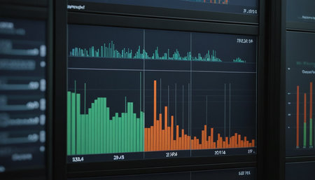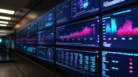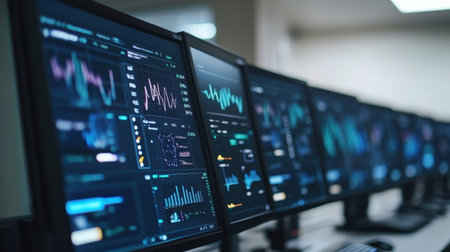 Data analytics in modern finance: monitors displaying graphs and charts in a tech office. That the image is generated using AI.