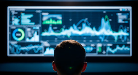 A view from behind of a data analyst or trader looking at a large, illuminated screen filled with a complex business intelligence dashboard. The screen displays various fluctuating graphs, charts, and data visualizations in real-time. This image symbolizes data science, financial analysis, stock trading, and modern technology.