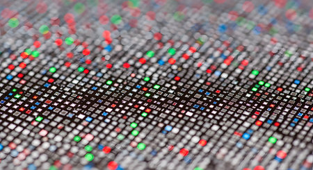 An extreme close-up, macro photograph of a digital LED screen, showing a grid of individual red, green, and blue pixels. The shallow depth of field creates an abstract technological background representing data and digital media.