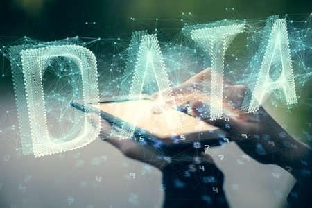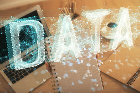 Multi exposure of woman hands working on computer and data theme hologram drawing. Tech concept.