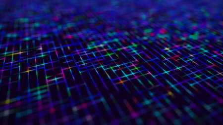 Abstract dark background with shining multicolor wireframe grid. Pespective colorful mesh landscape.
