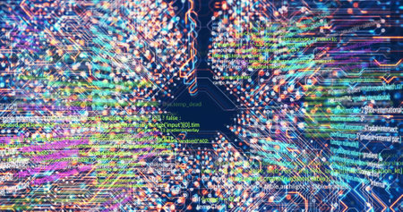 Digital image of binary coding data processing against microprocessor connections in background. school and education concept