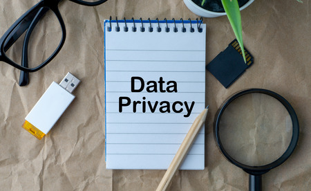 Notepad, flower vase, spectacle, storage card, pencil, magnifying glass and words DATA PRIVACY on wooden paper background. Business, education and copy space concept