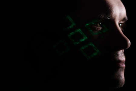 A young thoughtful man in profile, silhouette on a black background, projections of colored patterns on his face, man and technology, concept
