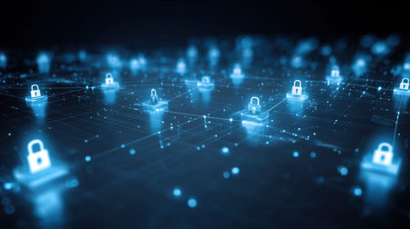 A captivating digital illustration showing a network of glowing padlocks on interconnected lines, representing security and protection in modern technology and data management.