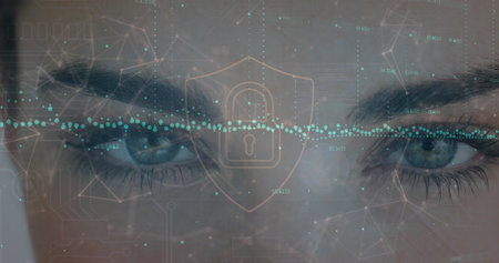 Image of padlock and data processing over blue eye. Global online security, digital interface, computing and data processing concept digitally generated image.