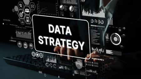 Conceptual Visualization of Data Strategy in Business with Technology Graphics and Analytics on a Dark Background. Asymptotic smart data analytic.