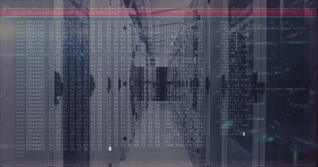 Image of data processing on computer screen tech room with computer servers. digital interface, global technology and connection concept digitally generated image.