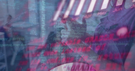 Software development company office. Database bits access stream visualization. Programming code abstract