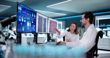 Multiracial Scientists Collaborating in Laboratory Analyzing Data on Computer Screen.