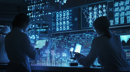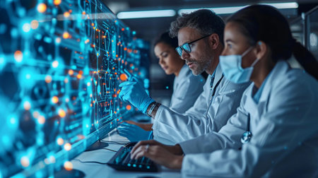 A dedicated research team explores intricate data in a modern laboratory. Advanced technology and digital interfaces enhance their scientific analysis and collaboration.