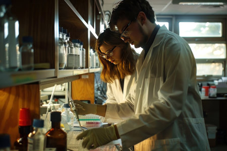 Scientists collaborate on an experiment in a lab. Emphasis on teamwork, research, and scientific discovery.