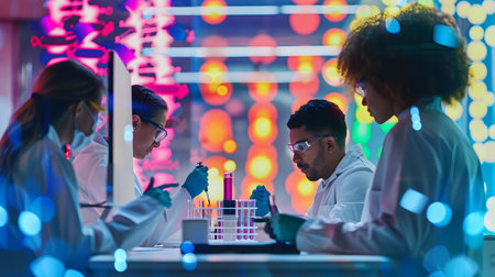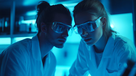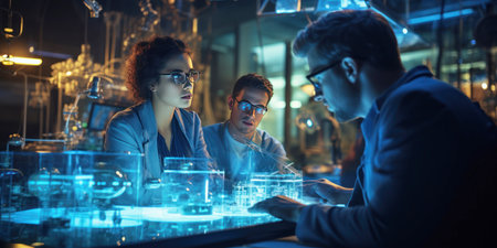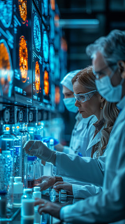 A focused scientific team conducts an experiment in a modern laboratory. The blue lighting creates a futuristic atmosphere, emphasizing the teamwork and precision involved.