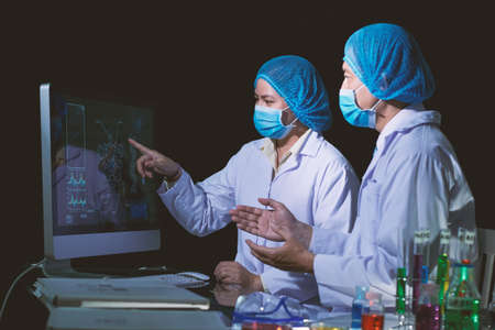 Gifted Asian scientist wearing rubber gloves and safety masks working together on creation of cancer vaccine, interior of dark laboratory on background