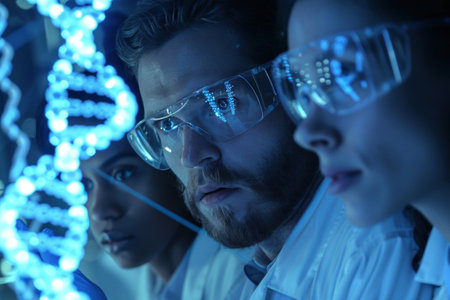 A group of scientists are looking at a computer screen with a complex image of DNA. They are wearing lab coats and gloves, and appear to be focused on the image. Concept of scientific curiosity