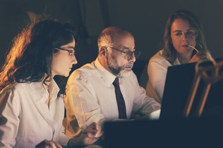 Serious business colleagues working at night. Focused professional male and female business people using laptop computers in dark office. Working late concept