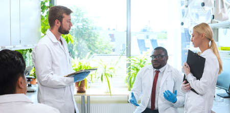 Scientist and students working in lab. Doctor teaching interns to make blood analyzing research. Biotechnology, chemistry, bacteriology, virology and health care concept.