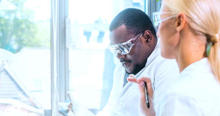 Young african american scientist checking samples with a mature female colleague. Two medical professionals working on experiments in the lab. Focused, diverse coworkers looking at products in lab