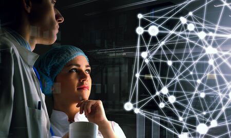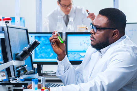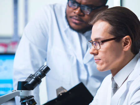Professor and his young and professional laboratory assistant are doing scientific experiment in a modern laboratory. Genetic engineers workplace. The concept of science, medicine and vaccine.