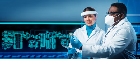 Professional team of scientists is working on a new vaccine in a modern scientific research laboratory. Genetic engineer workplace. Future technology and science concept.