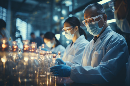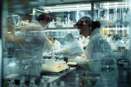 An intricate laboratory scene showcasing scientists in white lab coats working with advanced equipment and biological samples, research and development phase of biopharmaceutical products.