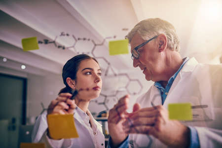 What do you think about my theory. Shot of two focused scientists working together solving equations on a glass wall in a laboratory.