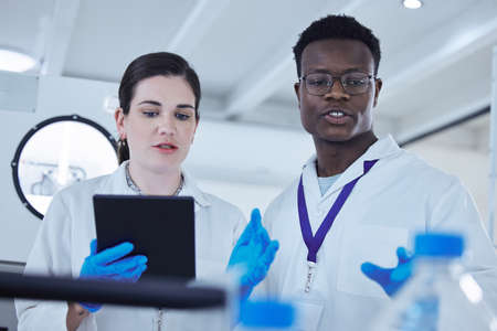 A day of innovation. Shot of two colleagues working together on a scientific project using a digital tablet.