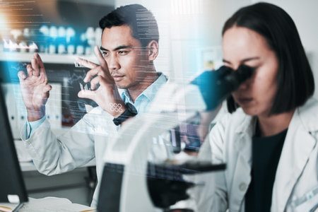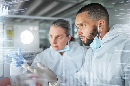 Science, technology and research on futuristic screen used by scientists in a lab. Innovation, digital transformation and future tech in healthcare, biotechnology and analytics in medical science