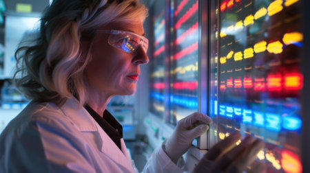 A scientist in a modern laboratory is deeply engaged in the analysis of technical equipment, amid a backdrop of glowing indicators and complex devices