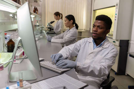 Young male scientist in gloves and whitecoat sitting in front of computer screen in lab