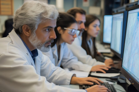 Group of scientists in lab coats intensely focused on computer screens, researching scientific information