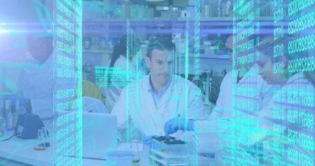 Image of data processing and chemical formula over diverse scientists doing experiment. Science and digital interface concept digitally generated image.