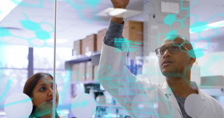 Collaborating scientists marking glass board at research lab, with turquoise digital graphics. Innovation, science, teamwork, data, analysis, technology, modern