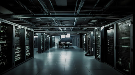 Dimly lit server room with glowing red lights and rows of servers creating a futuristic atmosphere