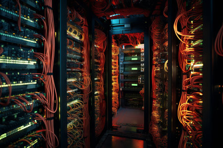 Tangled mess of red and yellow wires in a server room. Generative AI