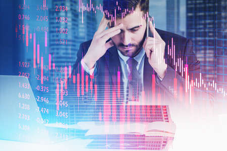 Portrait of stressed young businessman working in blurry city with double exposure of financial graphs. Concept of stock market. Toned image