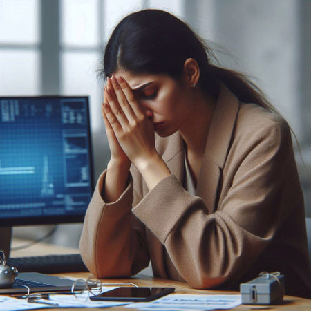 A photo capturing the tension and anxiety of a man sitting at a desk with his head in his hands.
