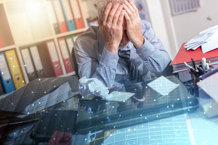 Overworked businessman sitting at a messy desk in office; multiple exposure